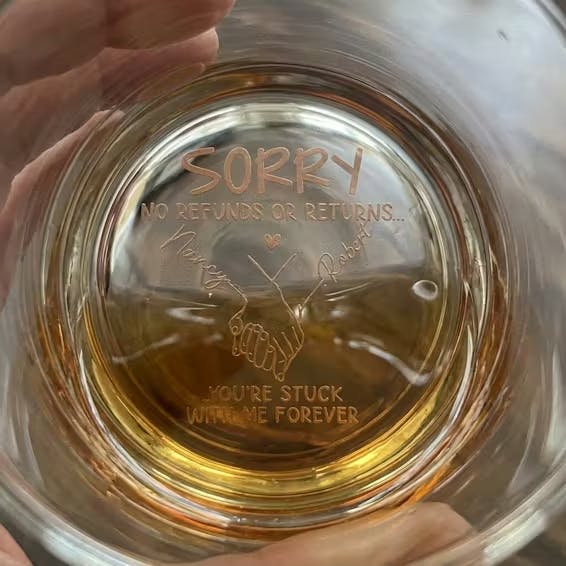 The quote made us laugh and the personalization was done beautifully. The glass has a nice weight and feels high quality. Definitely a great keepsake.