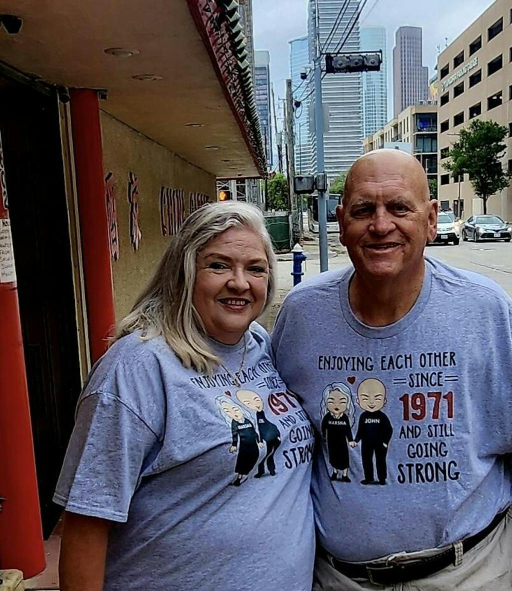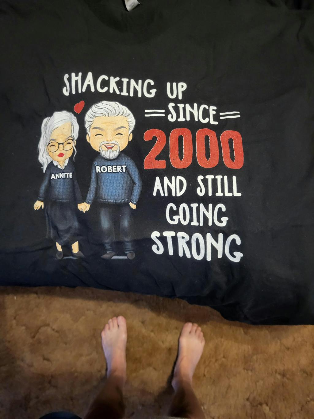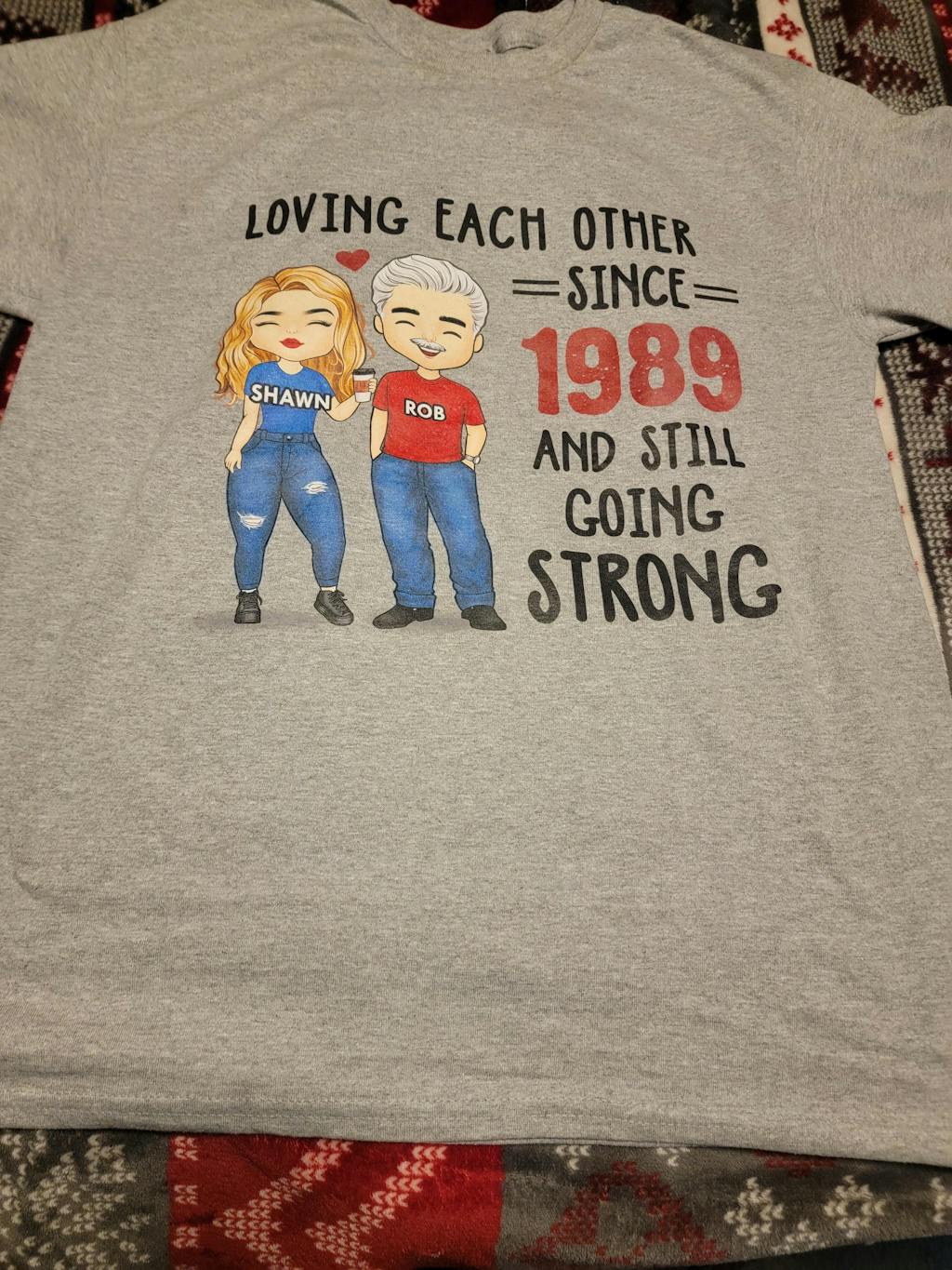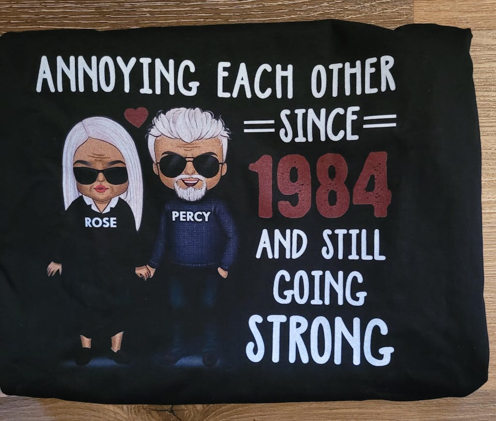 To mark a wood (5th), tin (10th), silver (25th), pearl (30th), ruby (40th), golden (50th), diamond (60th), or platinum (70th) wedding anniversary, this personalized shirt shows your and your sweetie's names, as well as the significant time you shared.