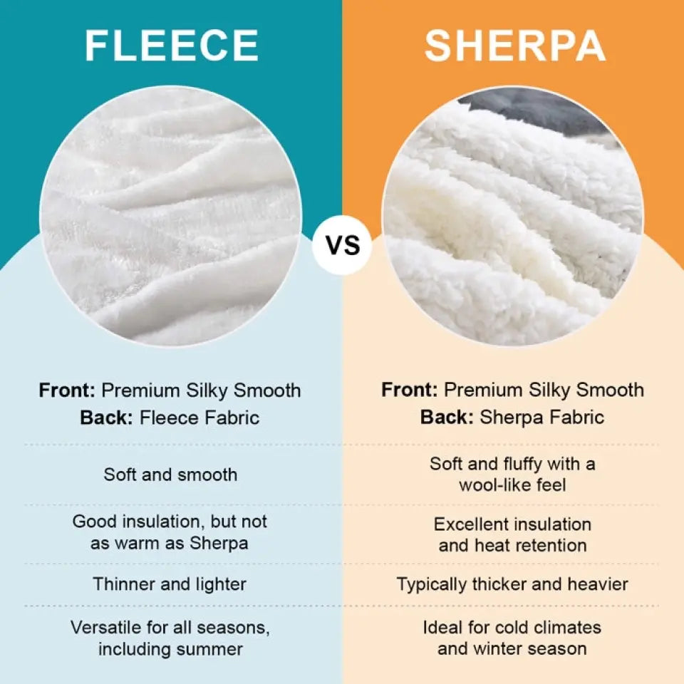 There are 2 material options - Fleece and Sherpa. Choose the material that fits your purpose.