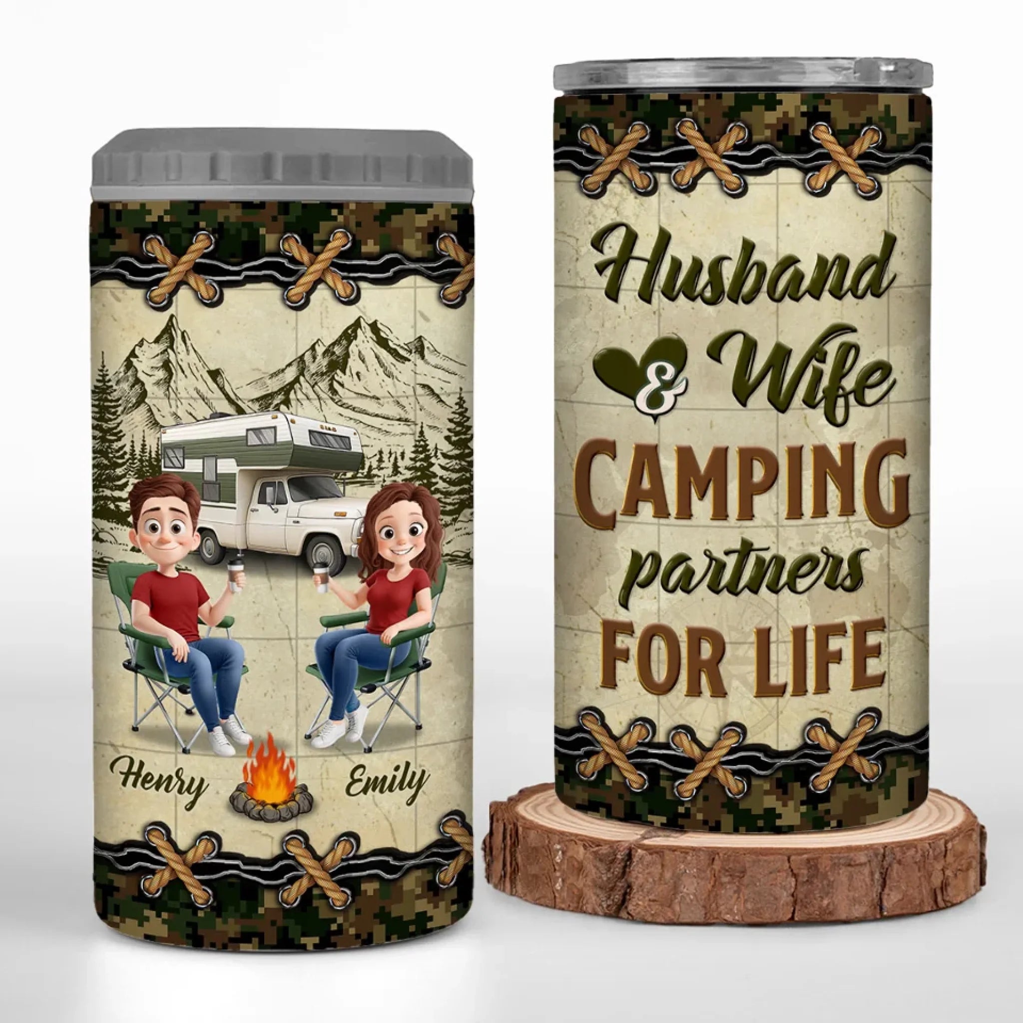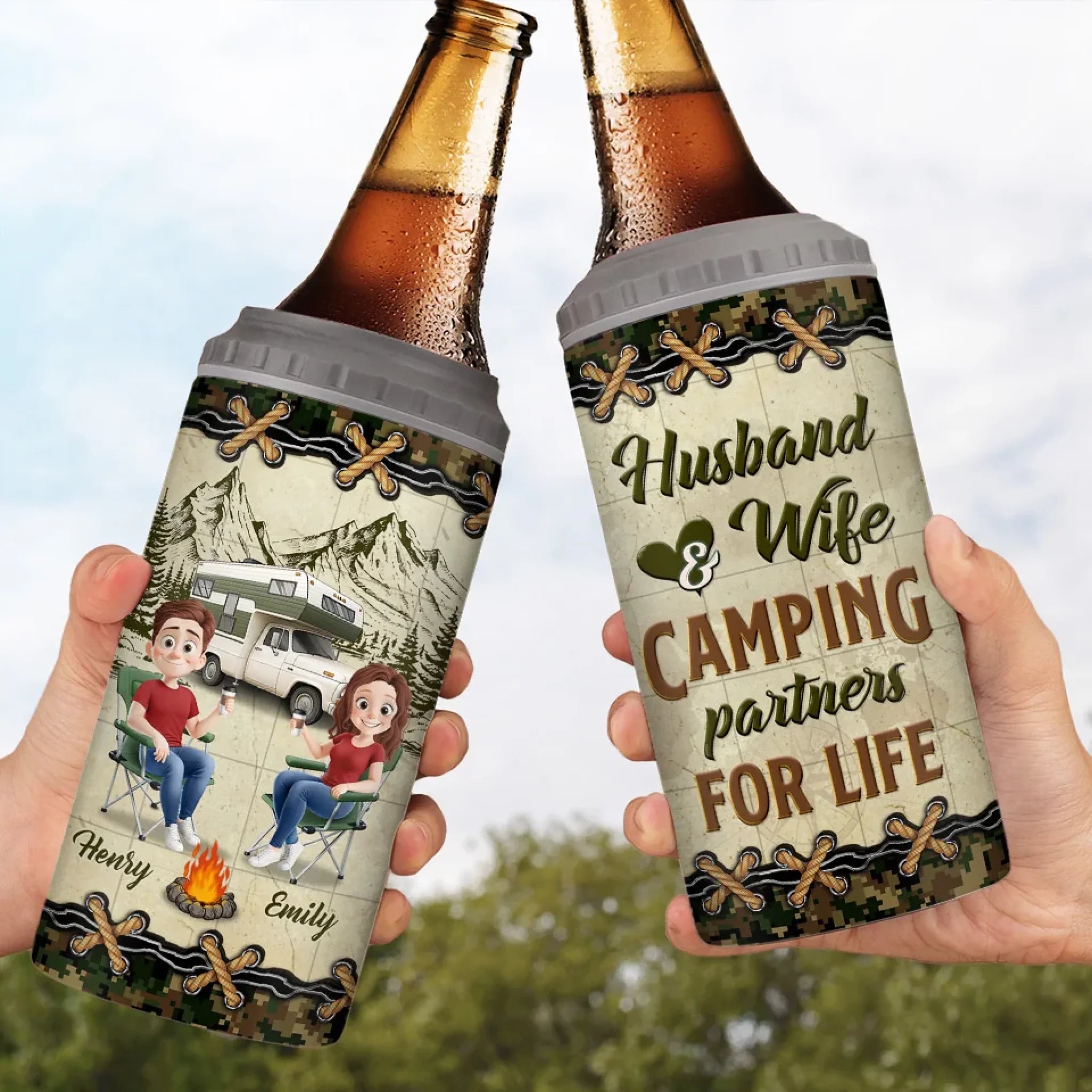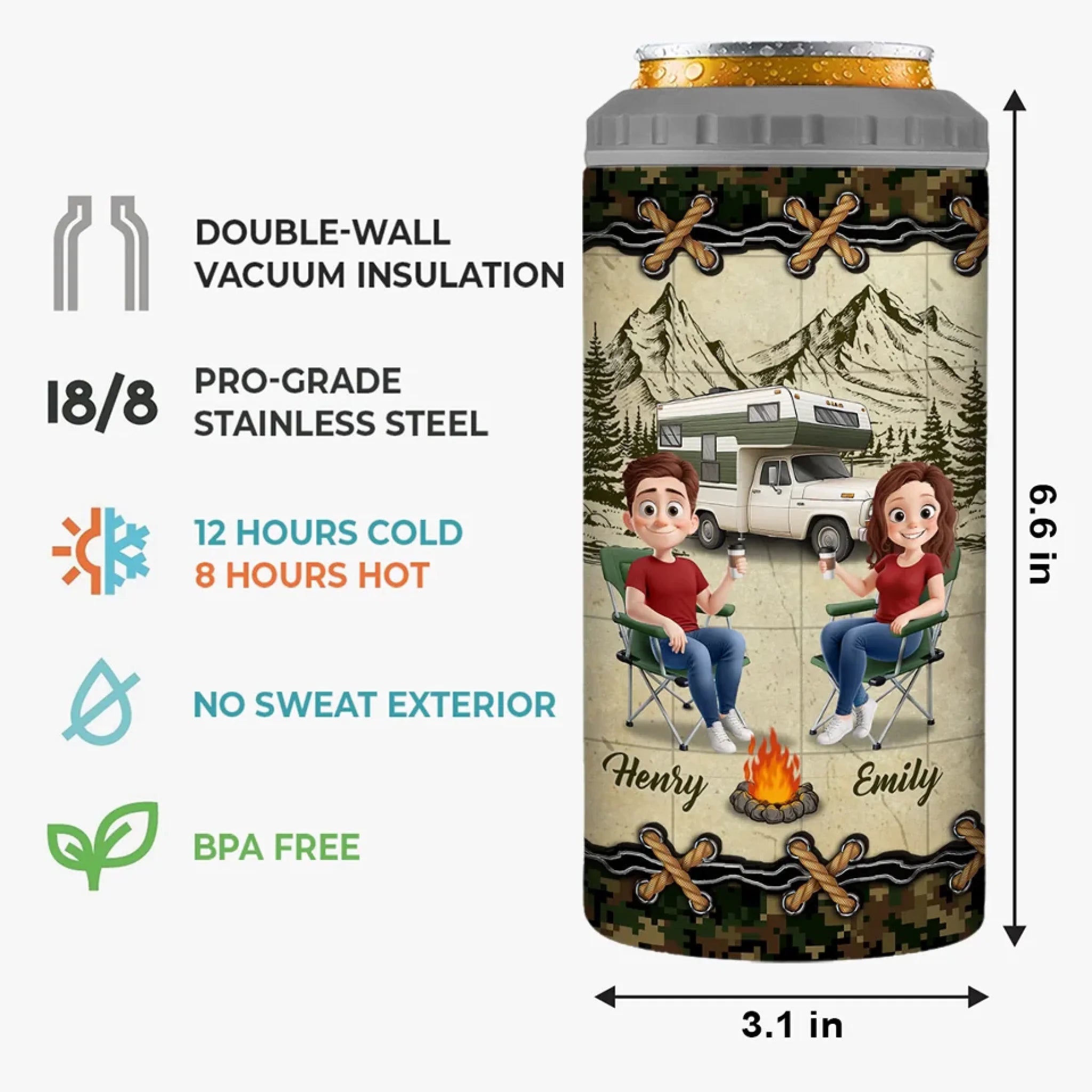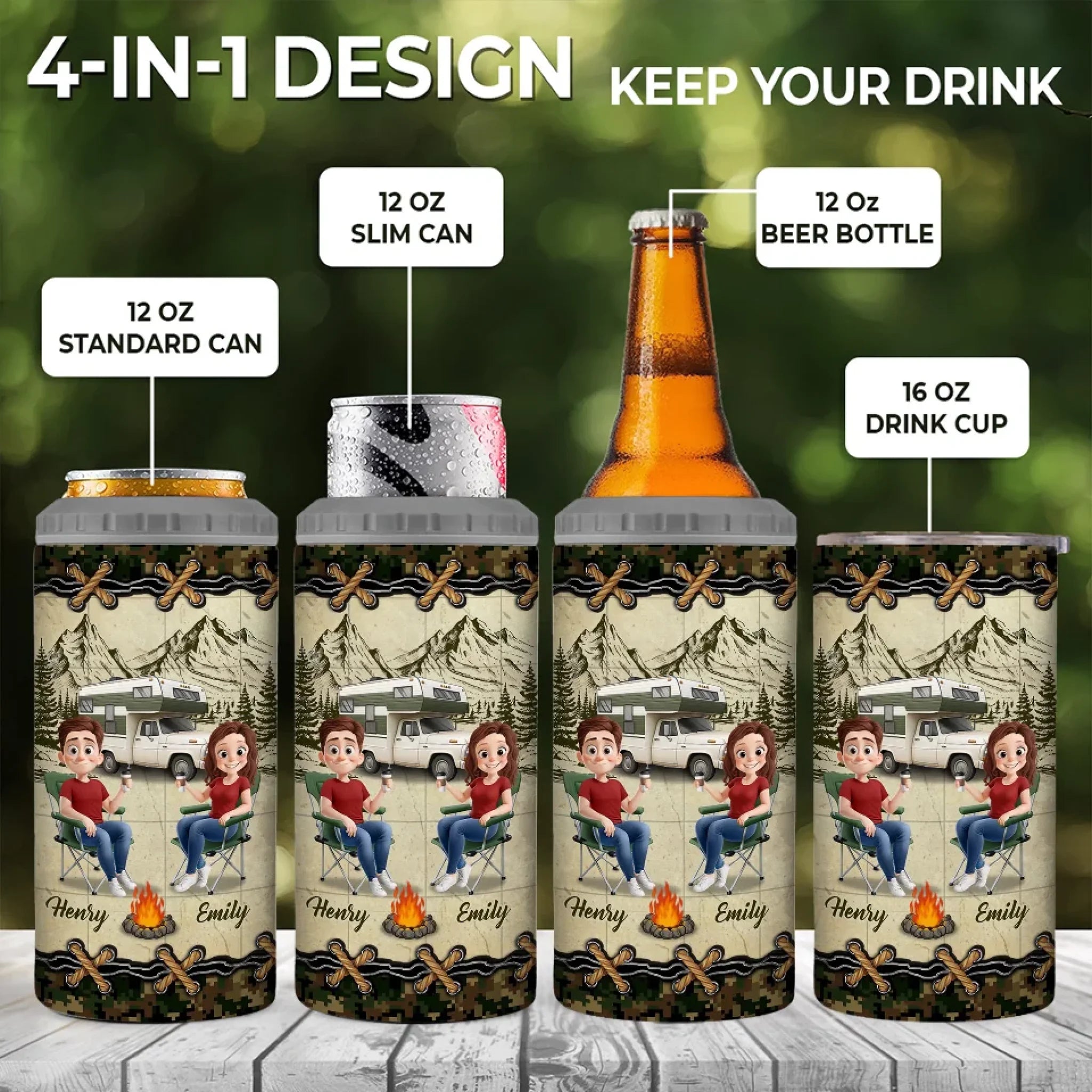 Adventure, Love, And A Campfire - Camping Personalized Custom 4 In 1 Can Cooler Tumbler - Gift For Couple, Husband Wife, Camping Lovers